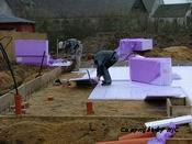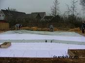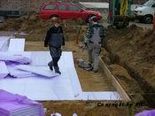 Nachdem die Perimeterdämmung verlegt wurde, kommt eine Folie darauf.